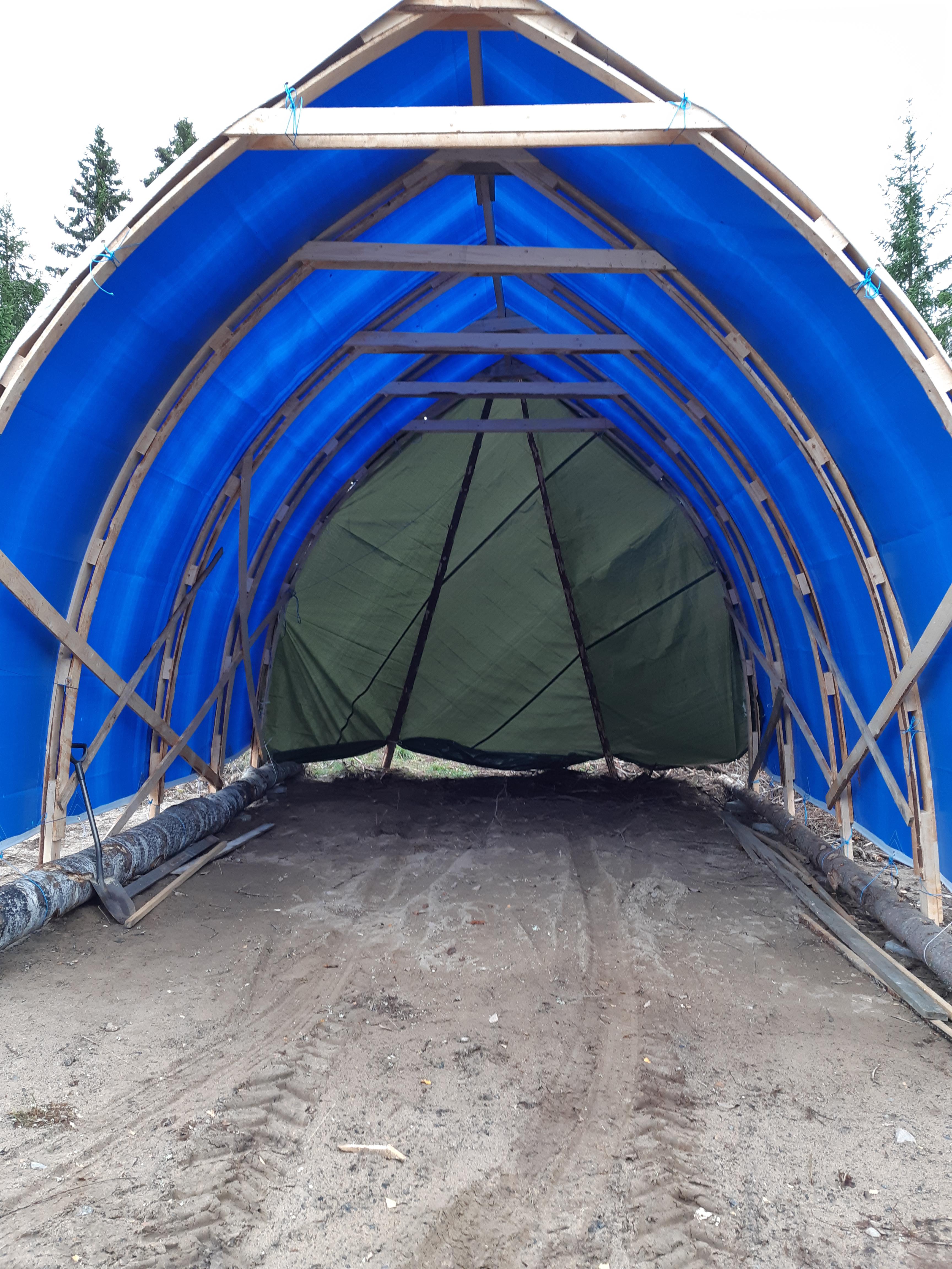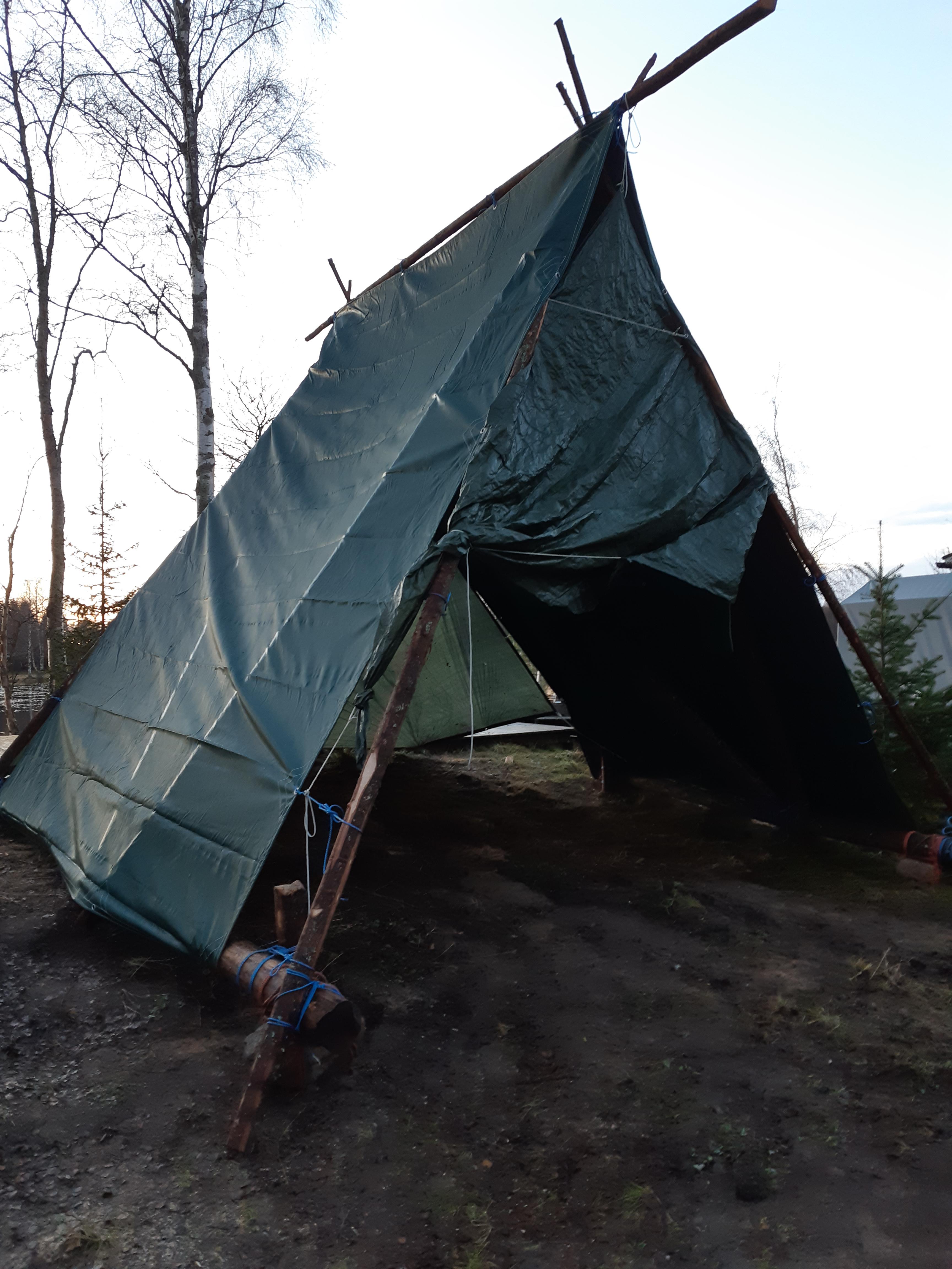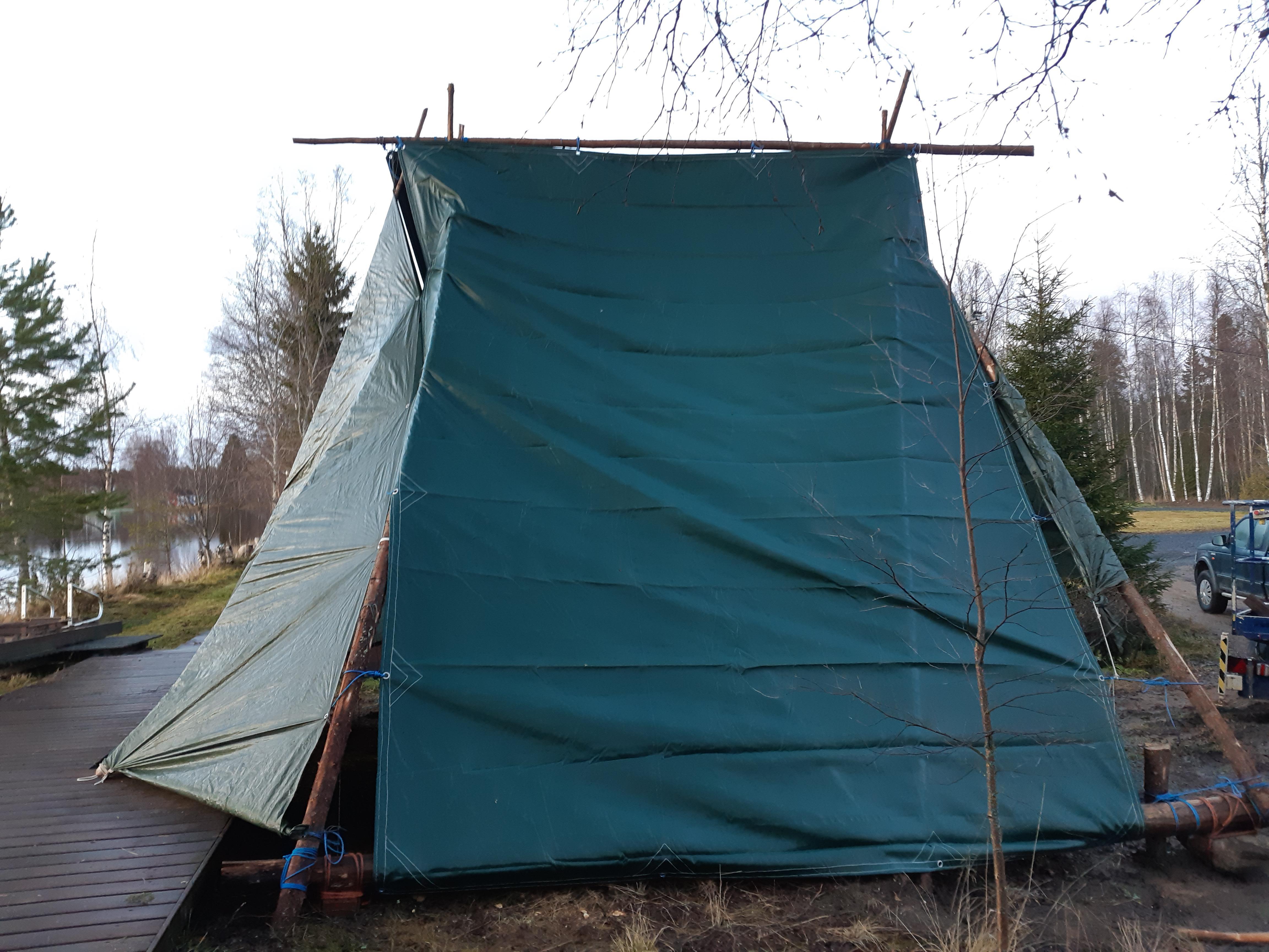 Päätyihin pitäisi saada pystyasennossa olevat rankapuut, jolloin päätyjen sitominen olisi helpompaa. Myös harjalle jää rako, josta tietenkin vähän sataa sisälle. Tässä pressuja ei voi nostaa harjaorren yli koska pystypuiden päät törröttävät yli harjan. Myös perustuksena olevat pölkyt sidoin varalta maahan hakattuihin tappeihin kiinni. Tässä kohdassa tuulee varsin paljon.