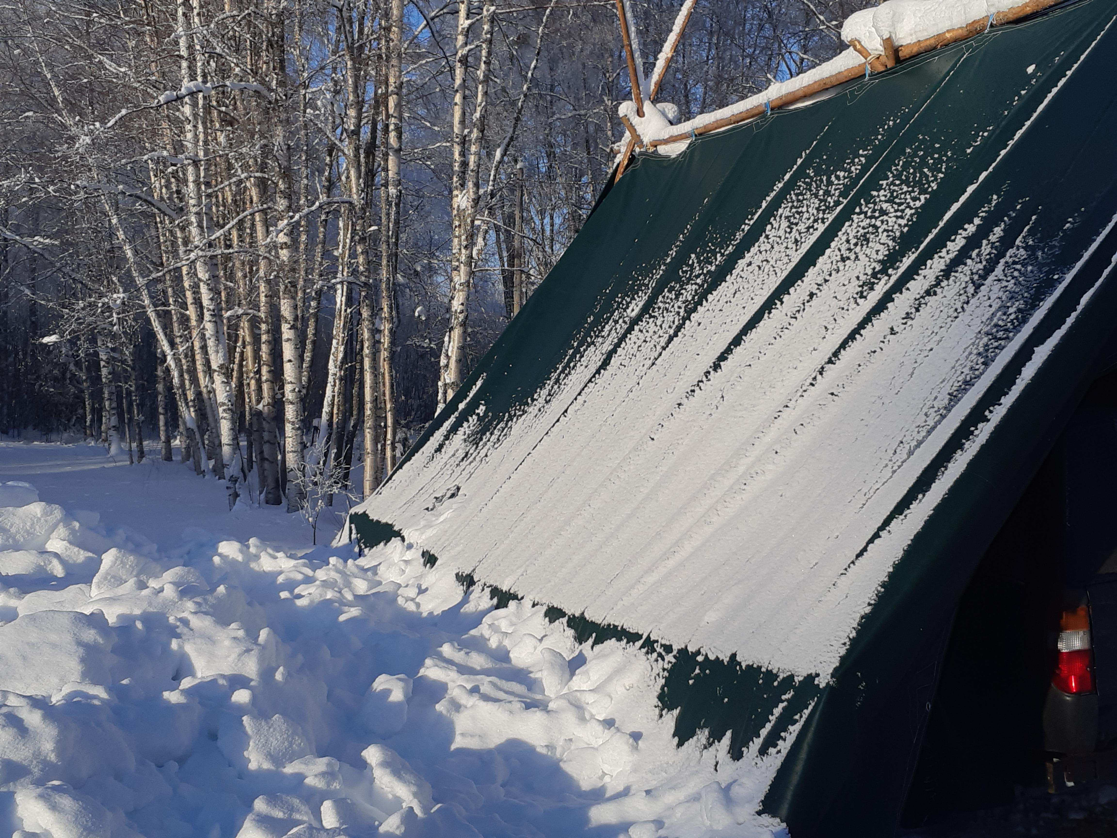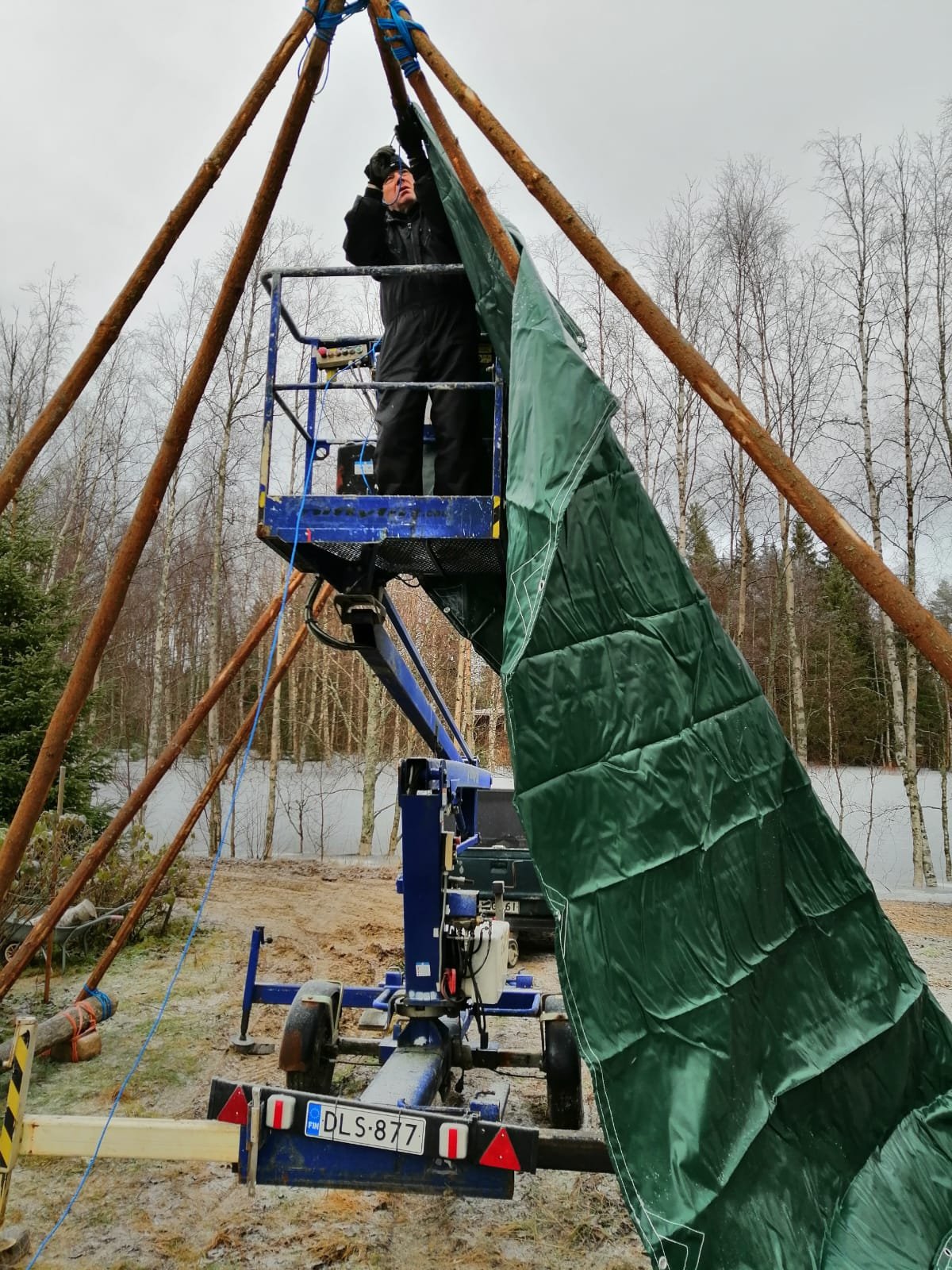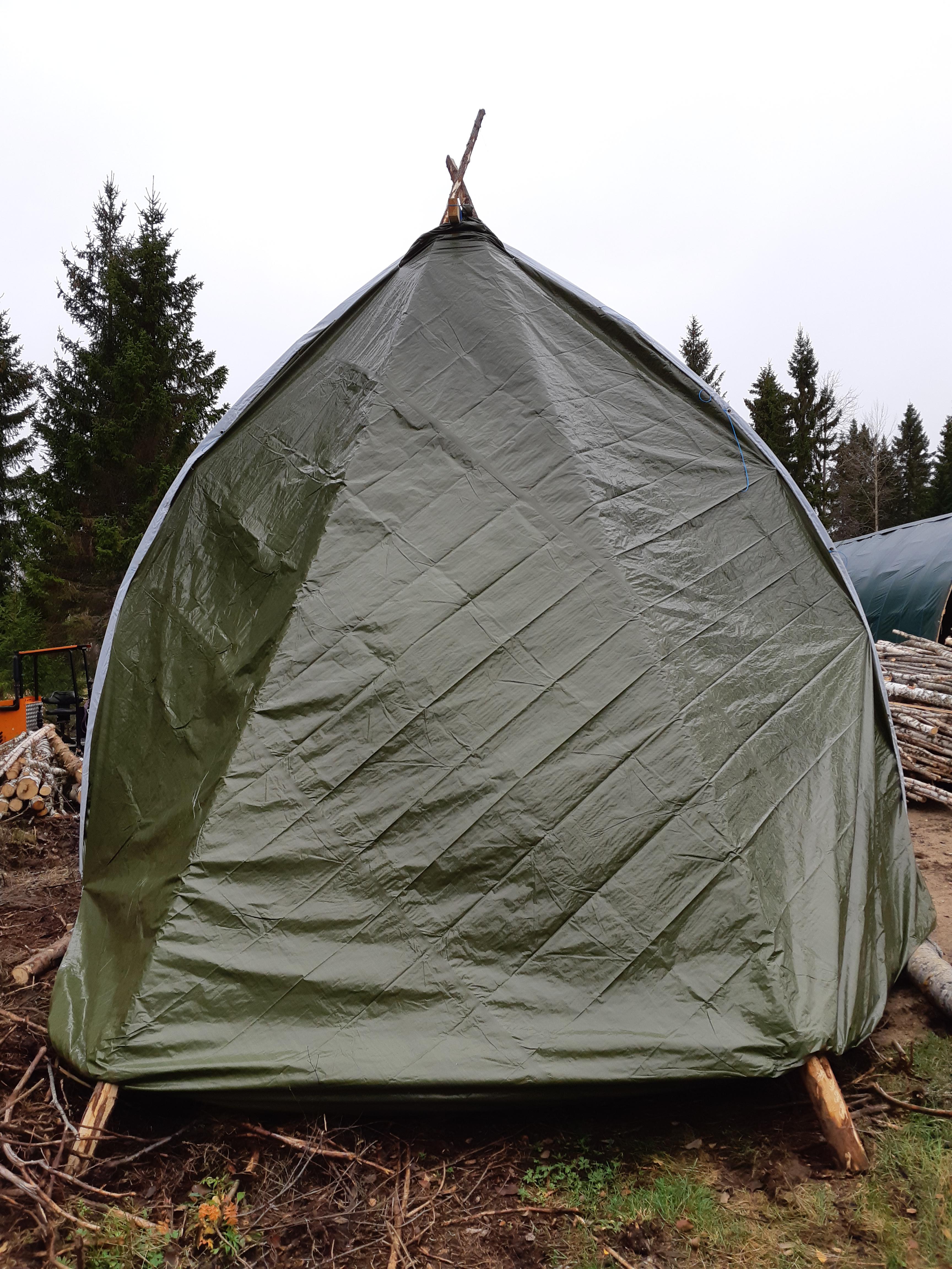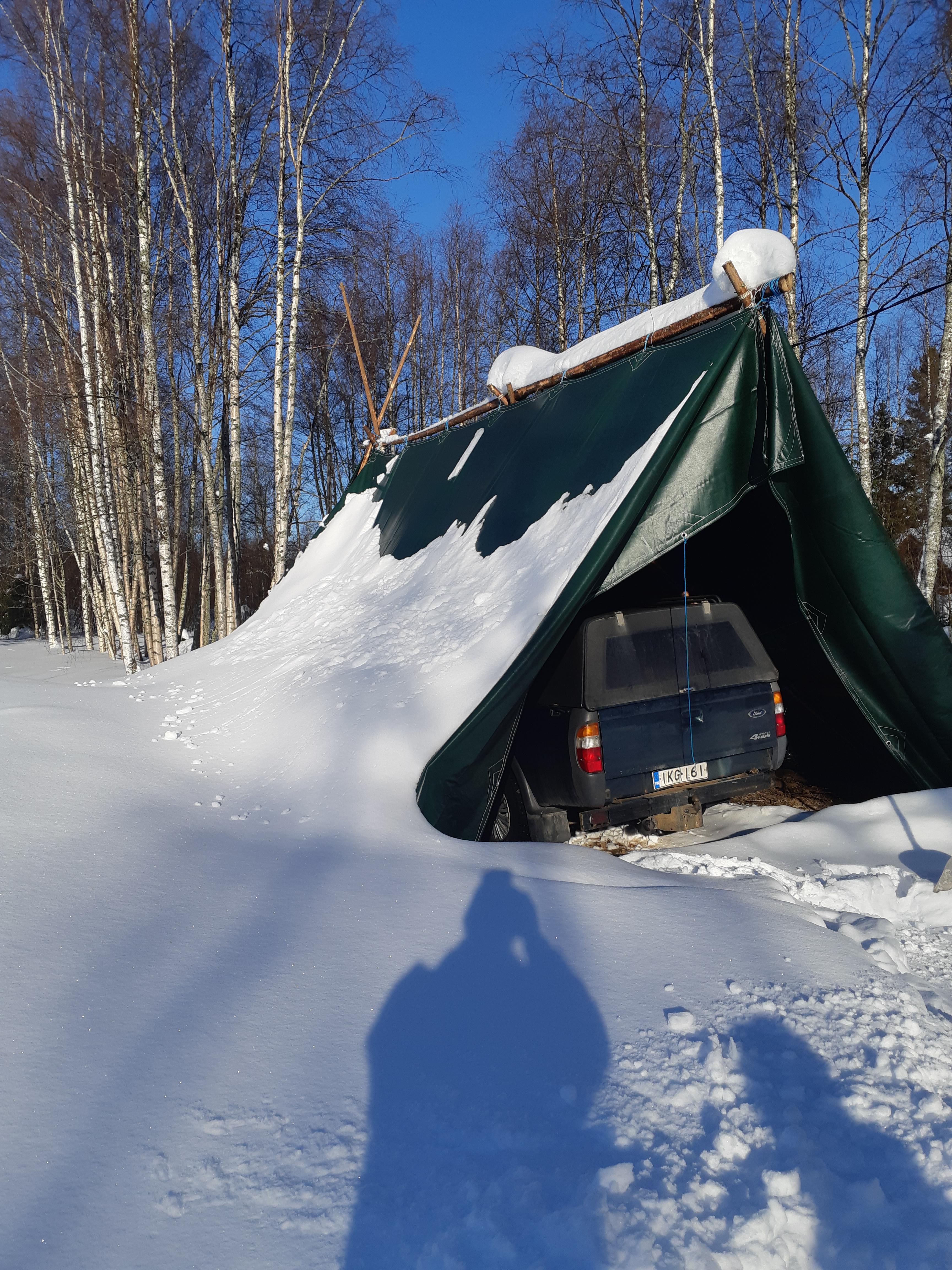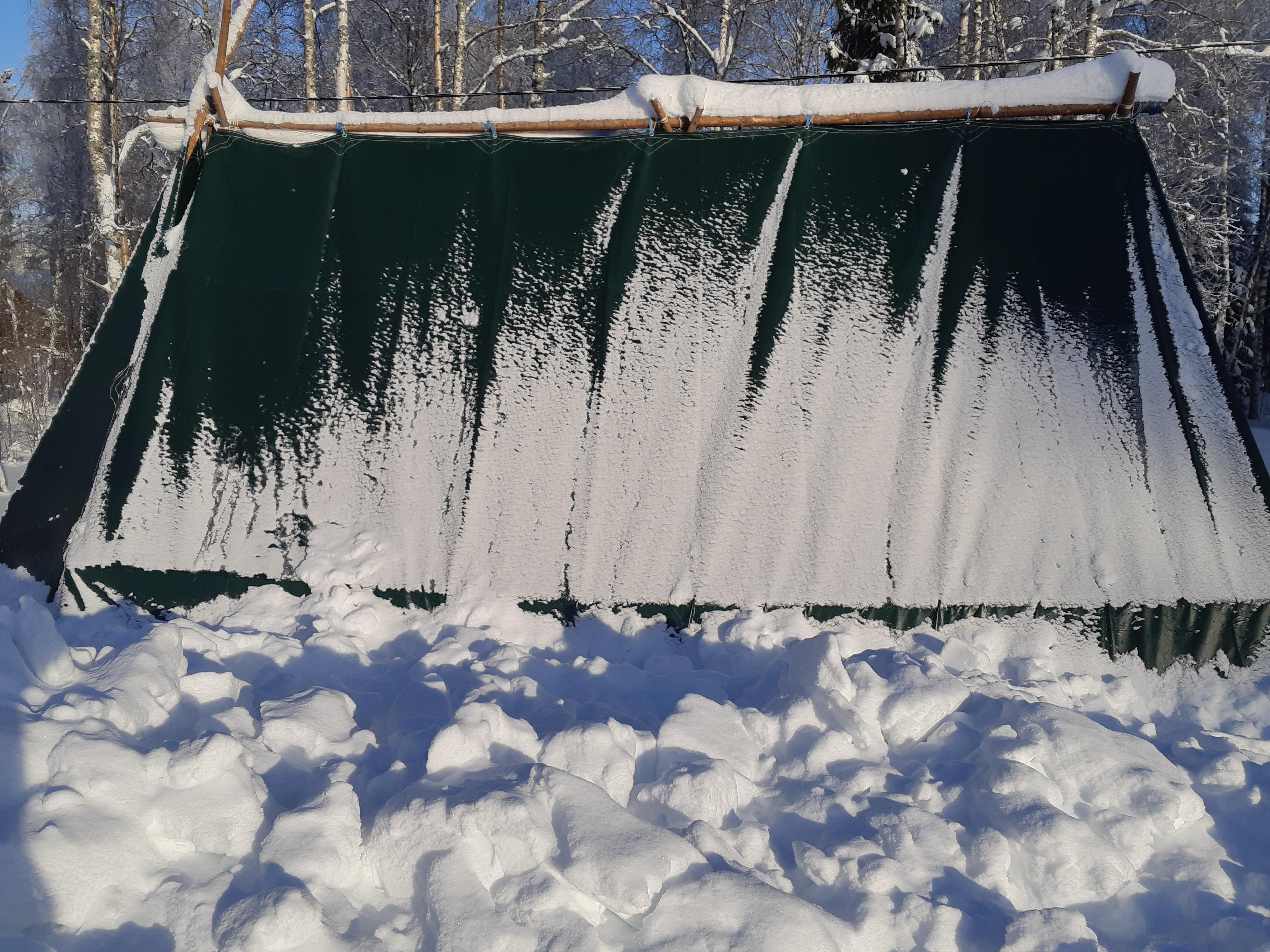 Ja vielä lisäksi lumitöitä on tiedossa, koska pressu yltää maahan asti. Seinien kaltevuus tuli melko loivaksi.