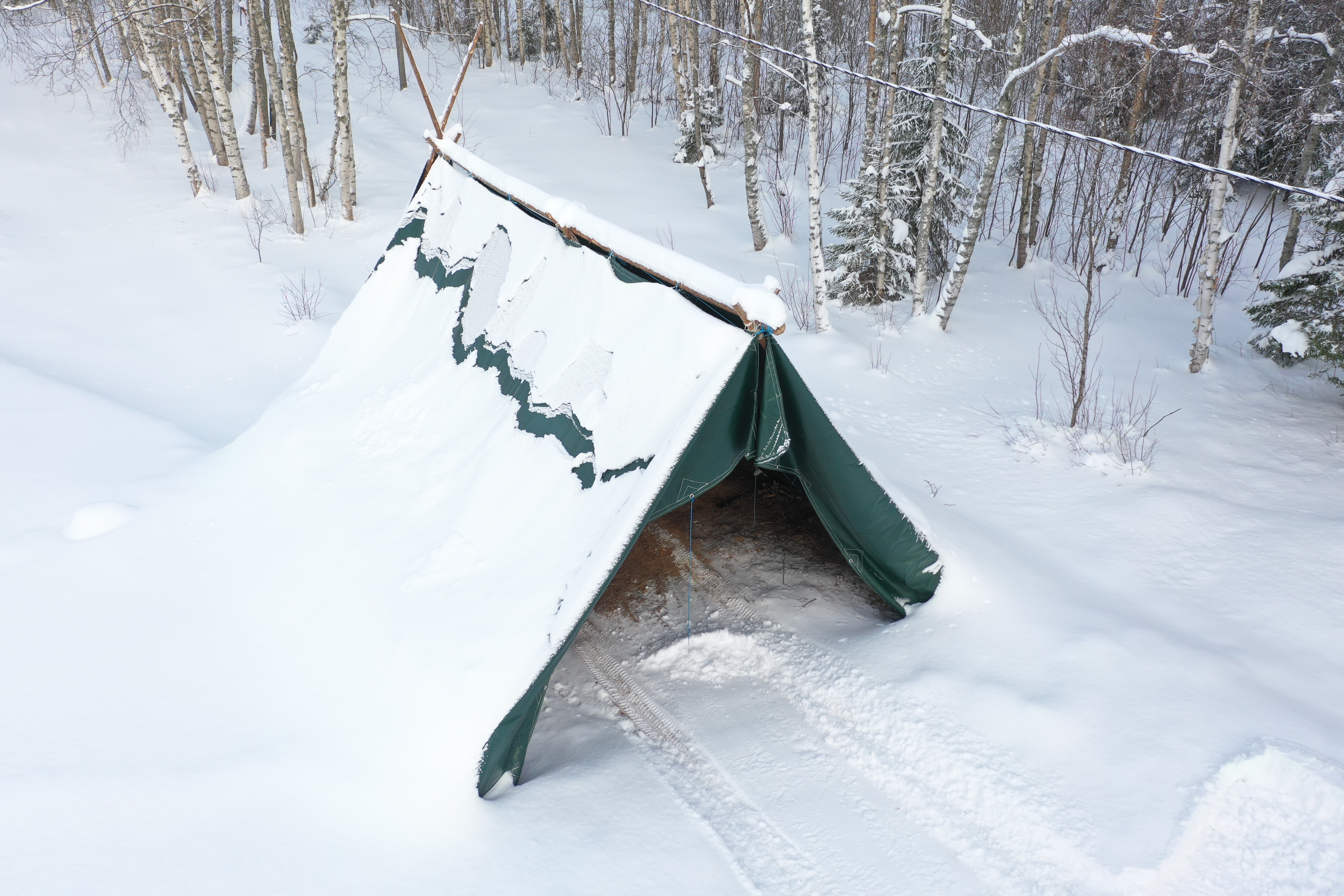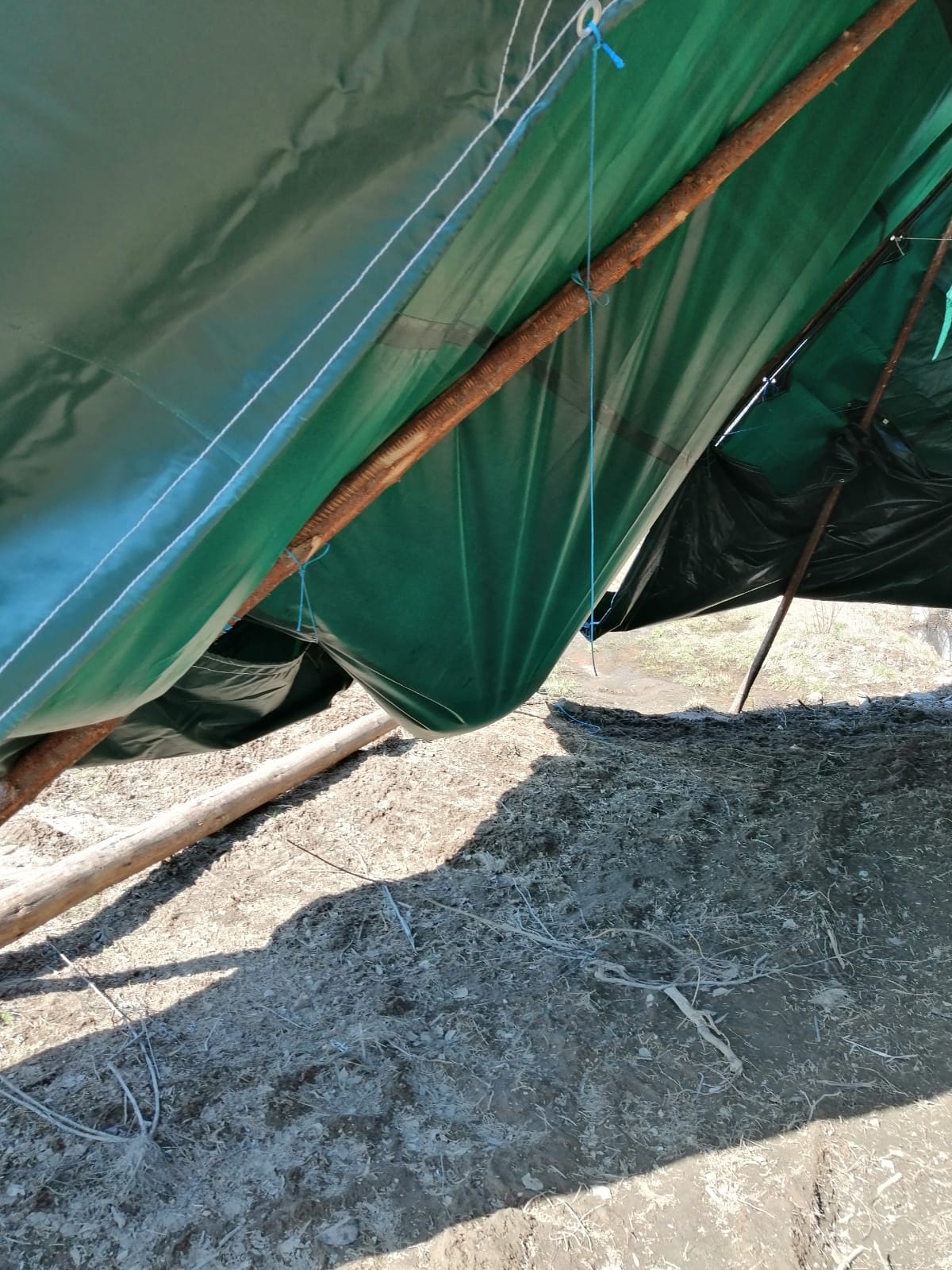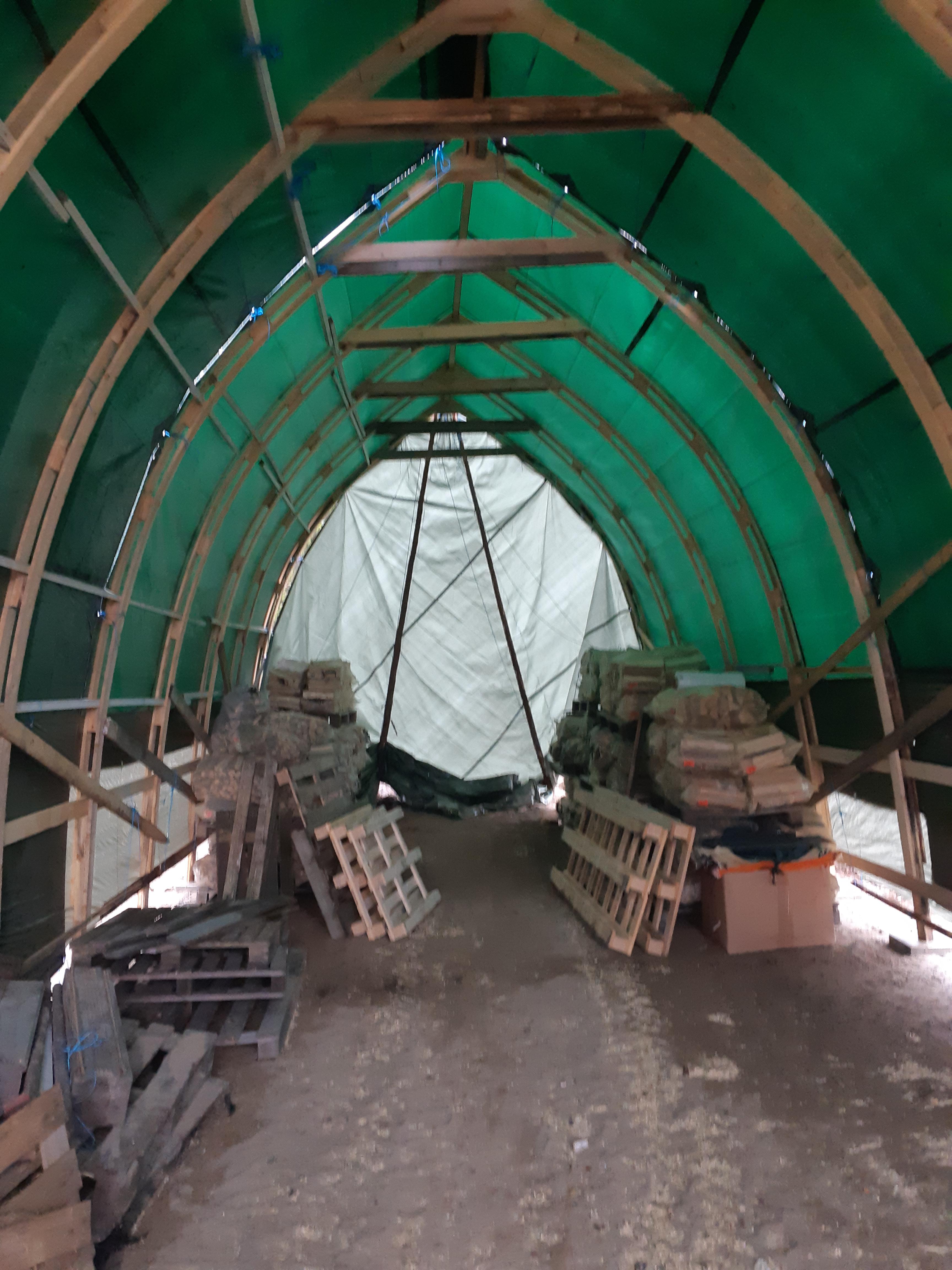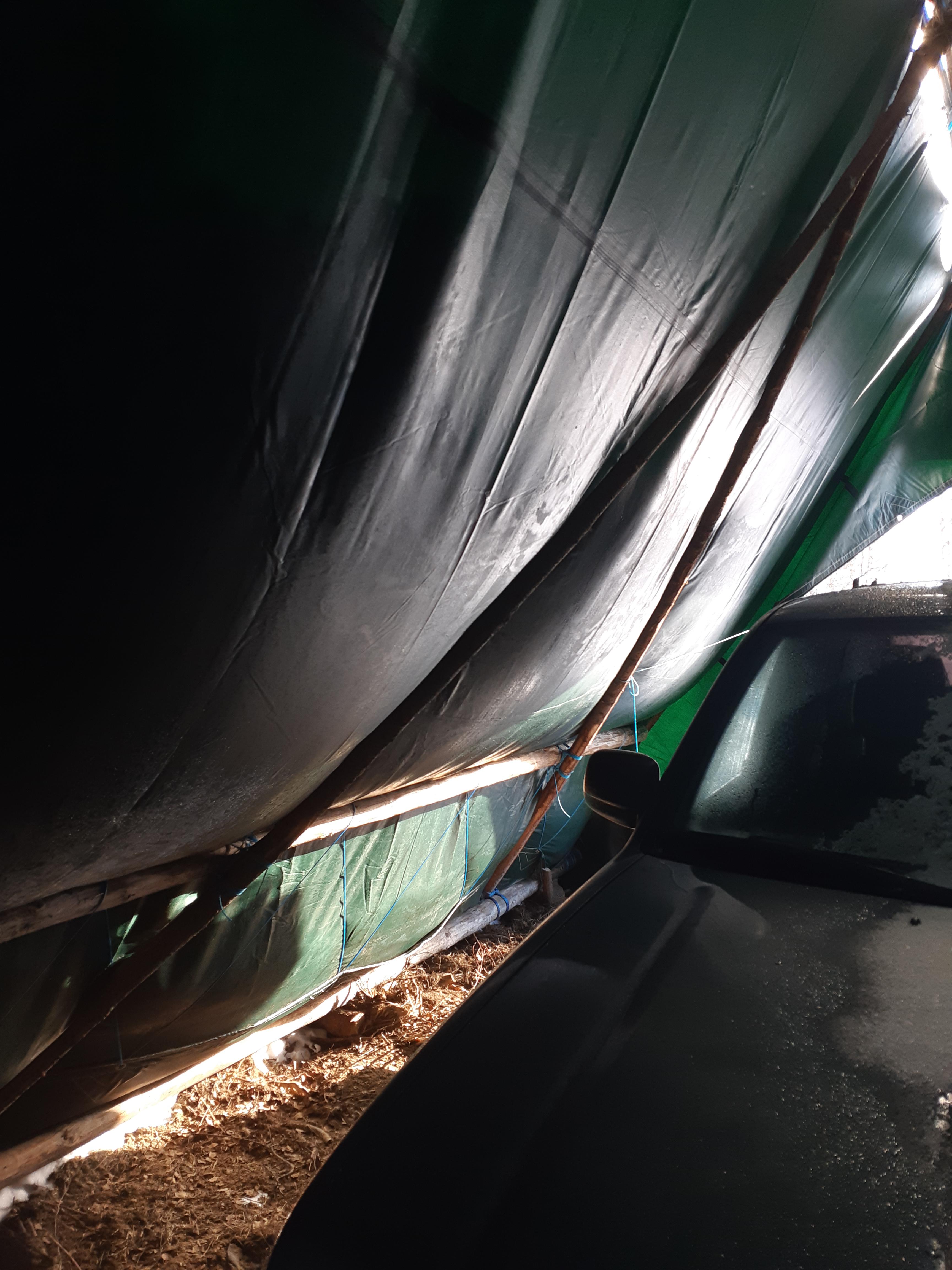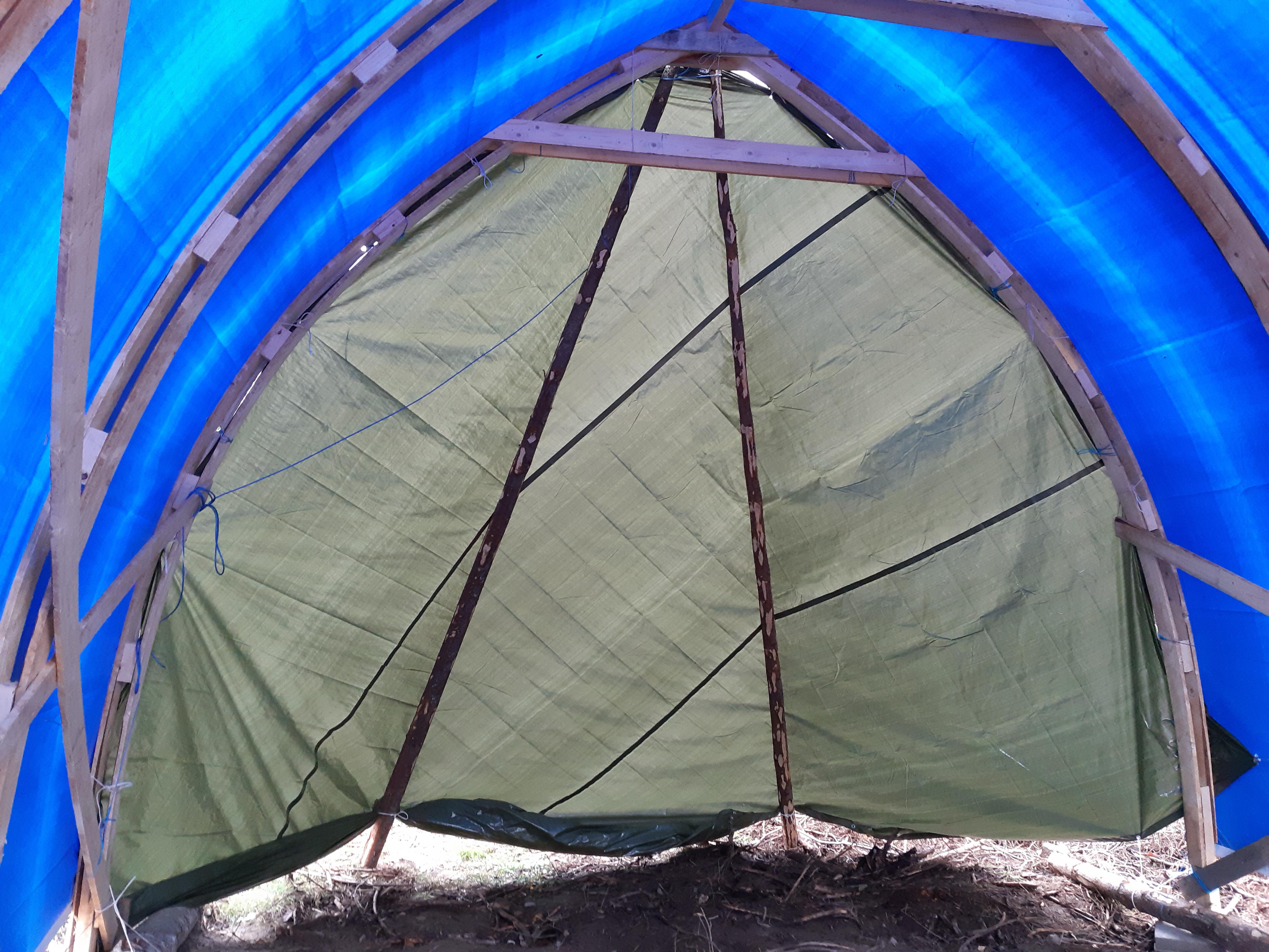 Siitä oppineena teimme parannuksen seuraavaa talvea varten. Runkoon piti lisätä lisää vaakatasossa olevia tukipuita. Niin ei jää enää mahdollisuutta pressun roikkumiselle ja veden keräämiselle. Tätä ongelmaa ei ollut ensimmäisessä versiossa.