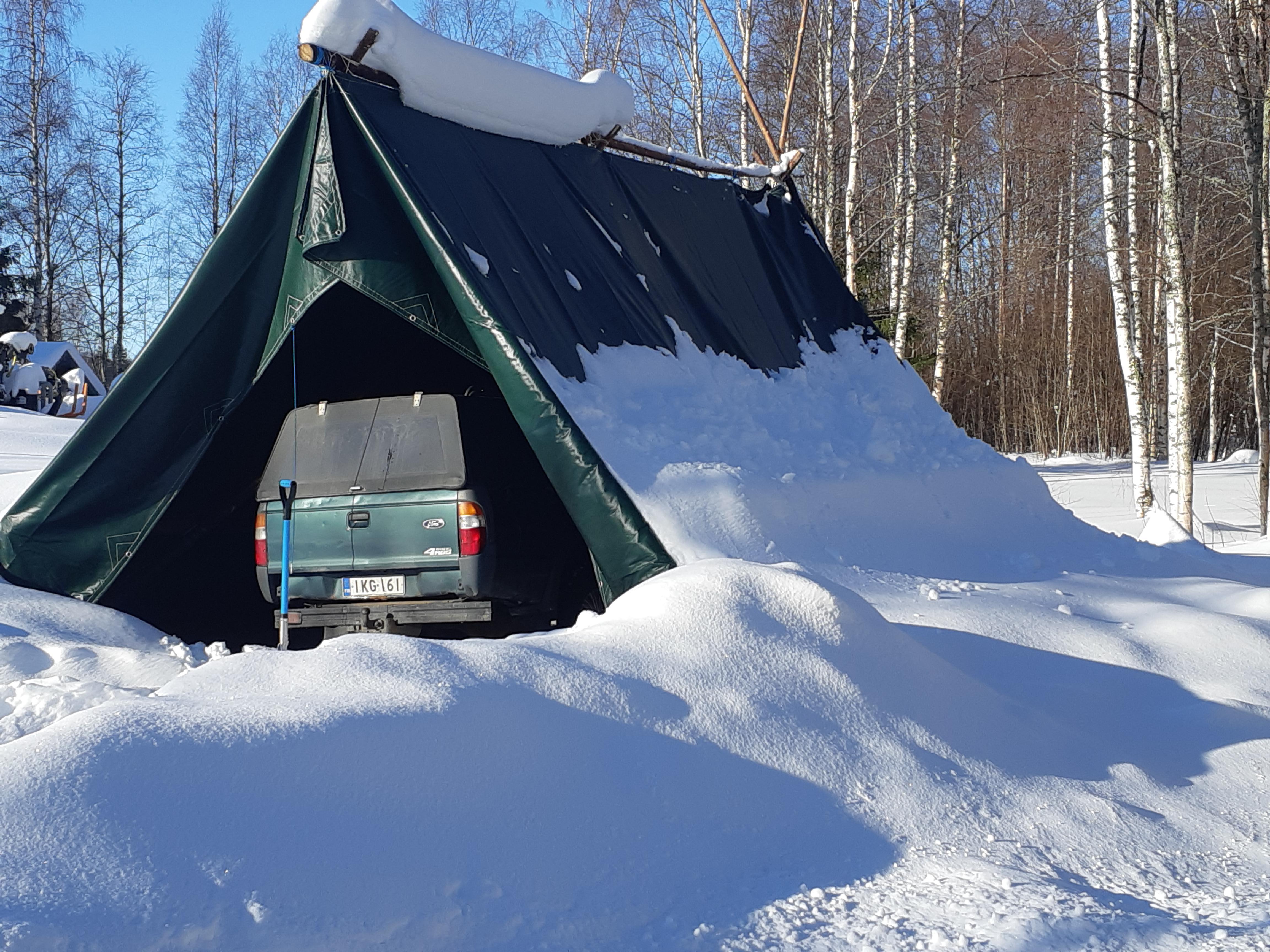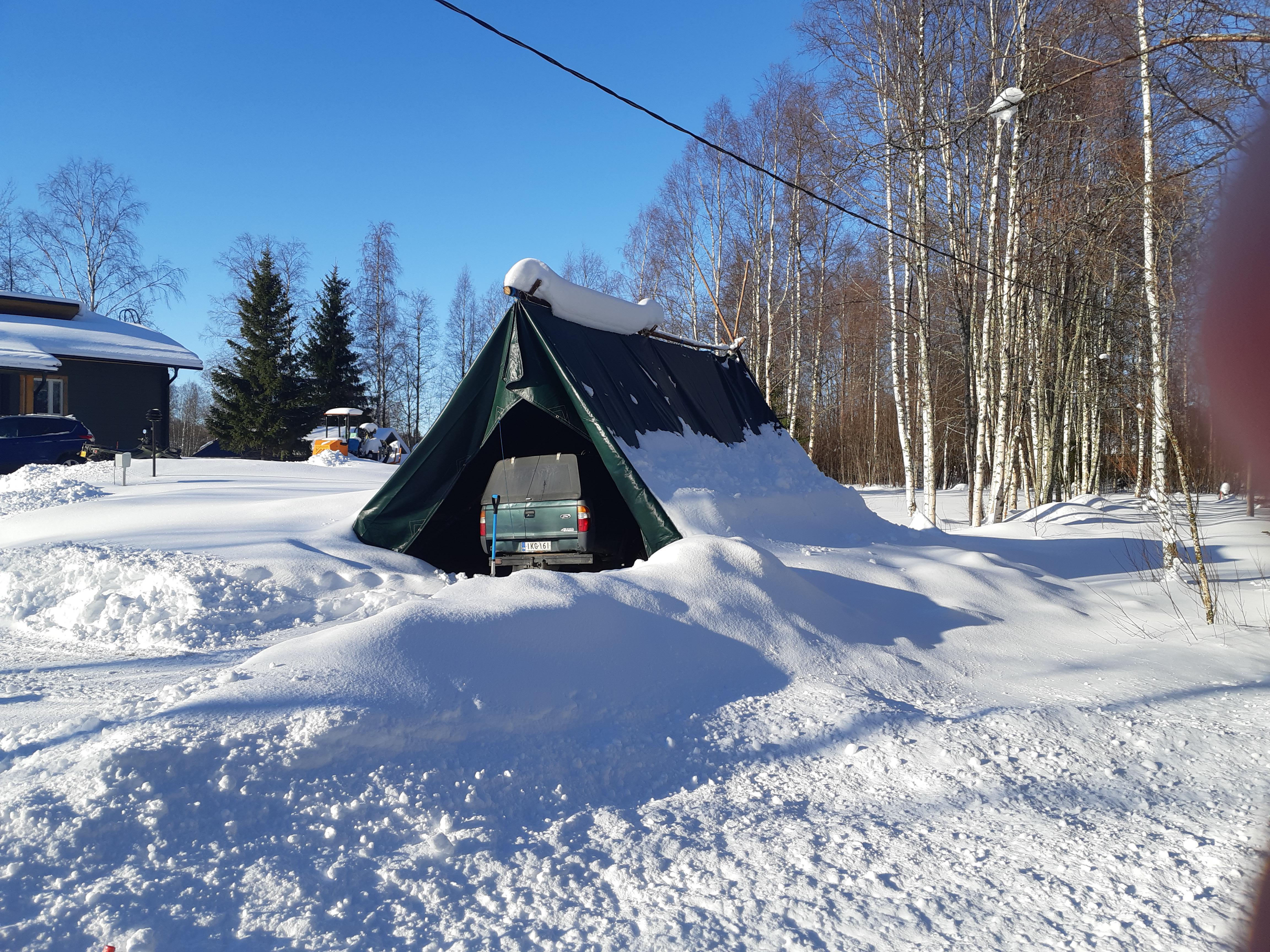 Tällä prototyypillä pärjäsimme tosi hyvin koko sydäntalven kevääseen asti. Ei ollut ongelmaa pehmeästä pohjasta ja luntakin piti lapioida seinämiltä vain kolmesti. Kerran lumipainoa oli jopa niin paljon, että rankapuut taipuivat huolestuttavasti. Vaikka piti lumikuormasta pitää huoli, niin eipä tarvinnut autoa lumesta ja jäästä rapata kertaakaan!