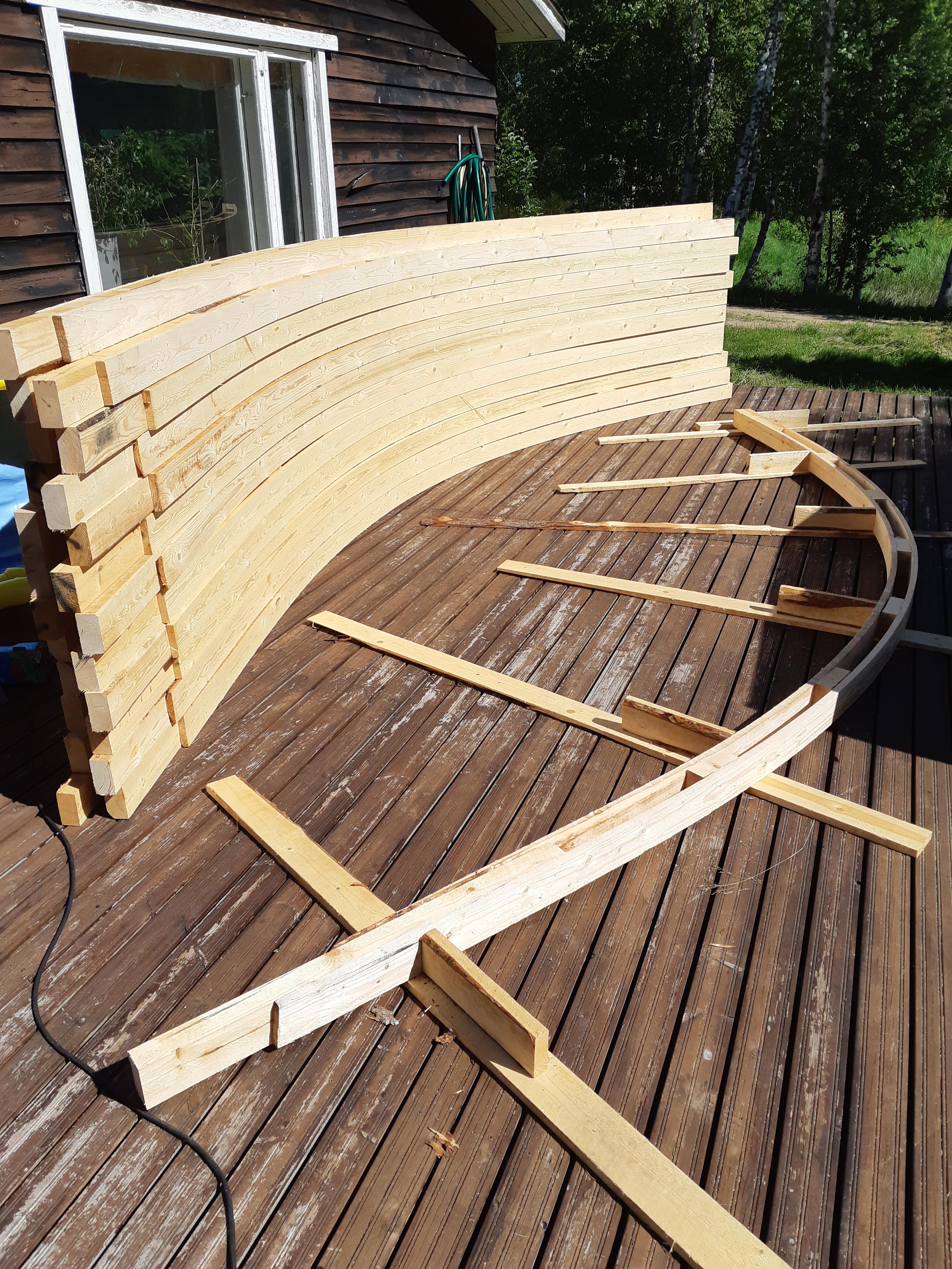 - lautojen kastelu ei auta. Ei ne ime tasaisesti vettä. Niiden pitäisi olla kauan märkinä ennen taivuttamista. Lyhyellä kastelulla laudoista tulee vain kieroja kaaria.