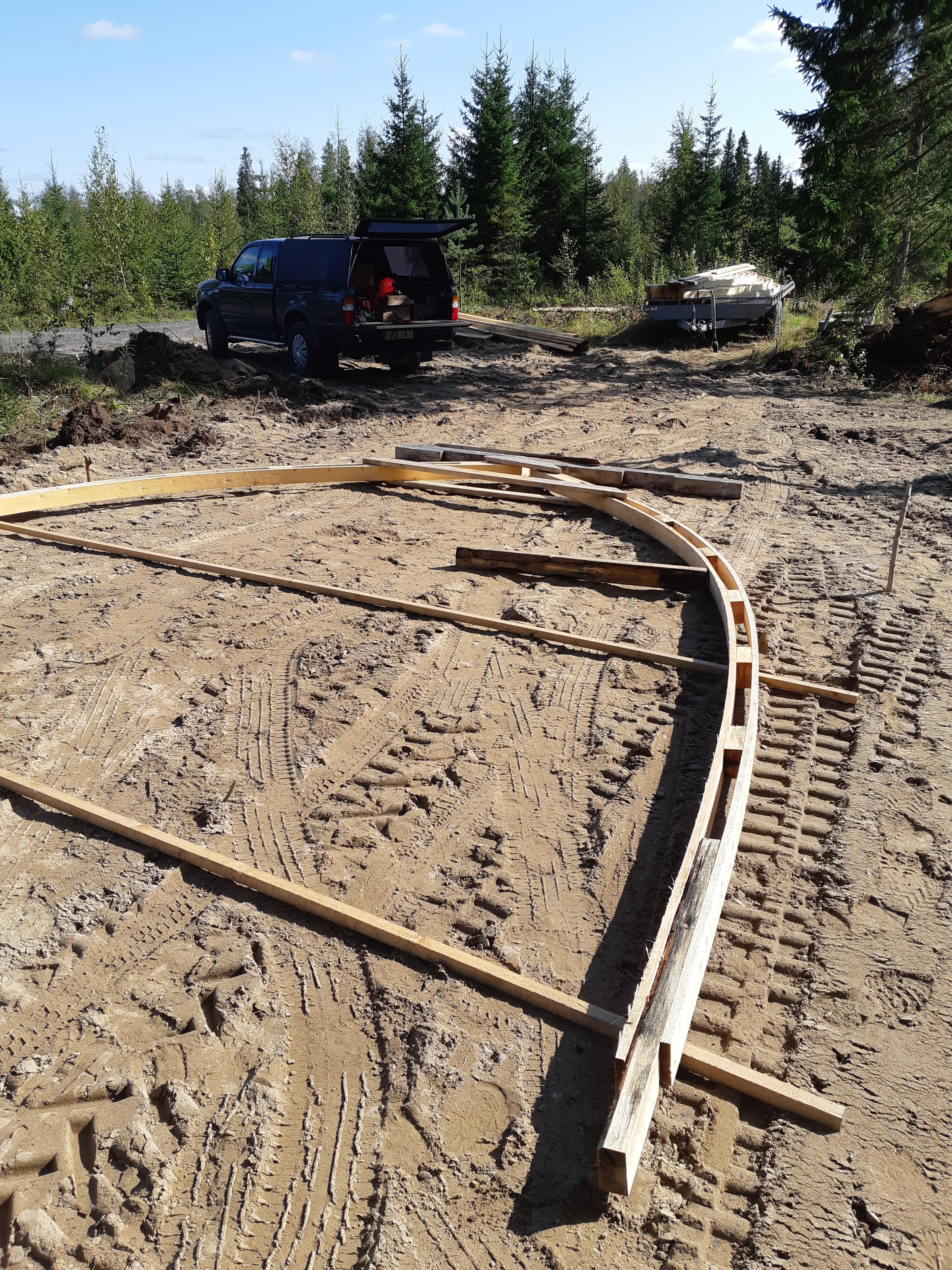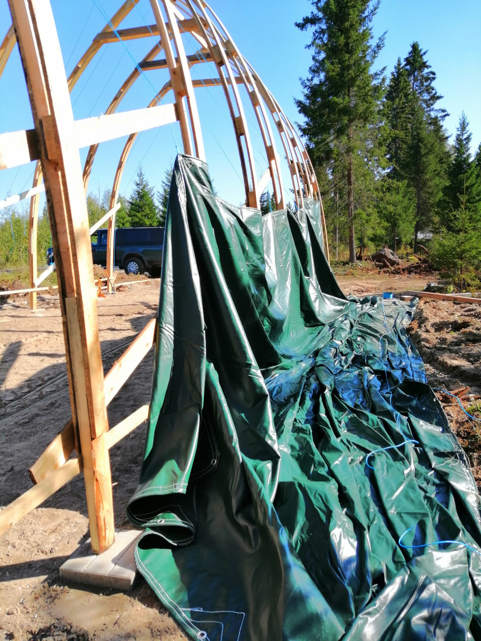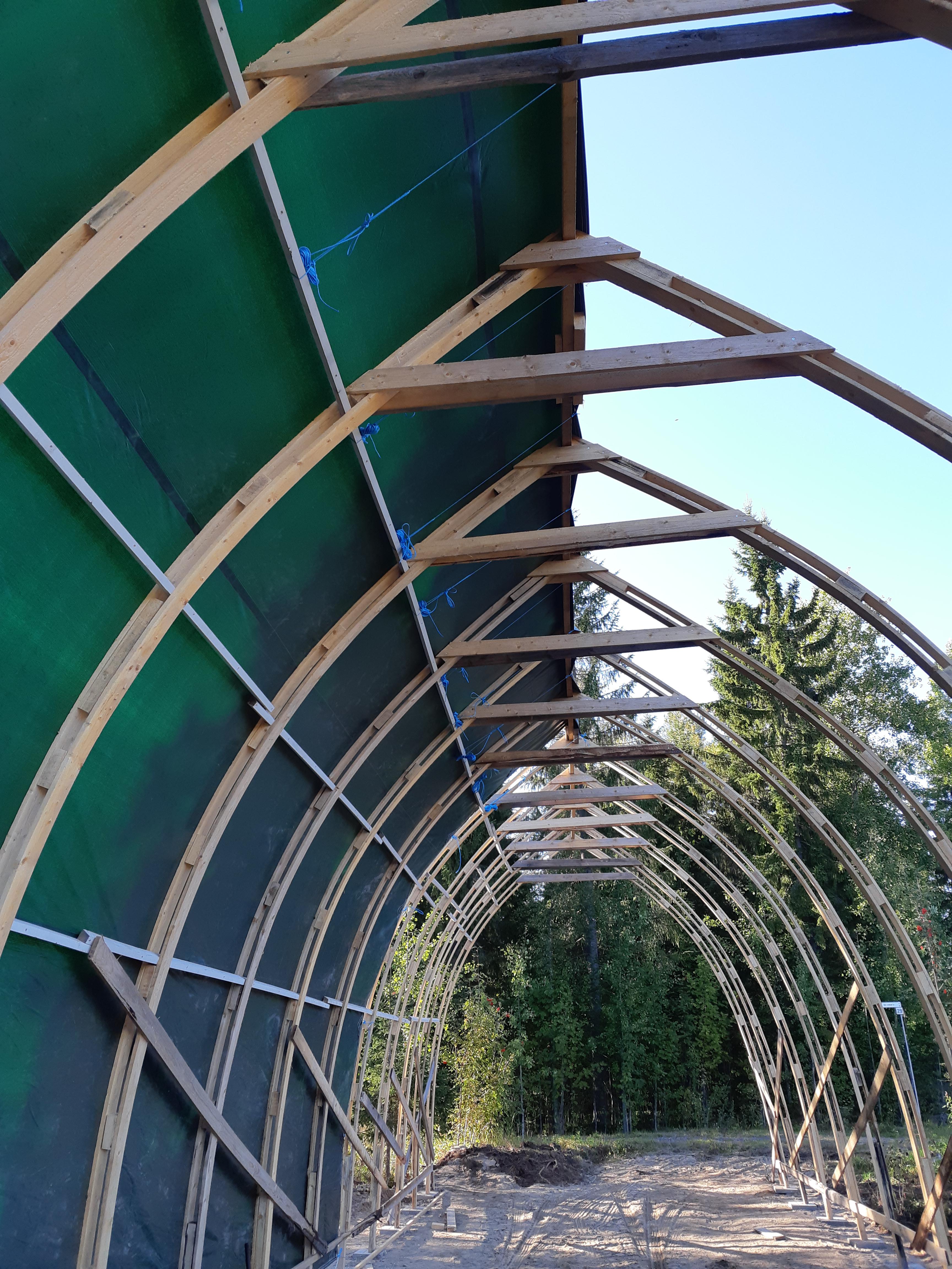Kaarikatosta varten sahautin kuusilautoja omista puistani, joita oli poistettava sähkölinjojen vierestä. Kutakin kokonaista kaarta varten tarvitaan neljä lautaa ja jonkin verran lankkua. Tässä versiossa kuluu terassiruuveja paljon, mutta köyttä vain pressujen kiinnitystä varten.