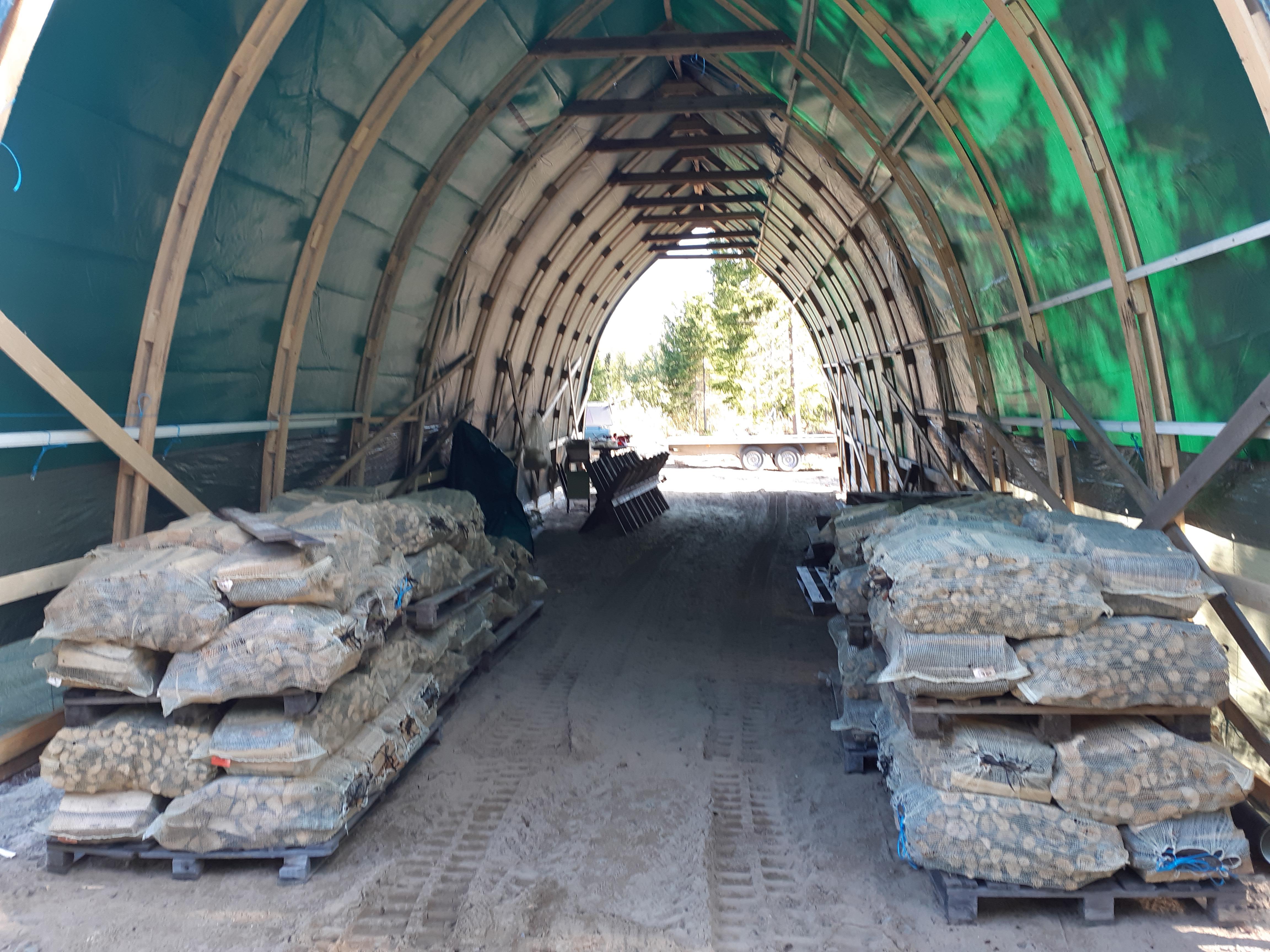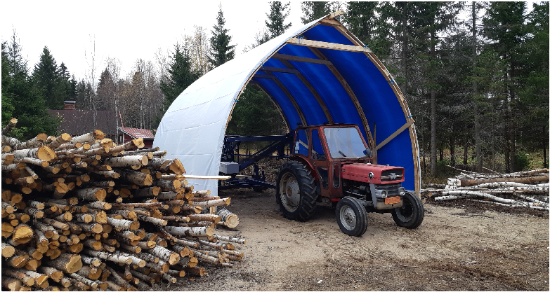 Ensimmäinen vaatimus katokselle oli, että sen pitää olla niin kevytrakenteinen ja jopa väliaikainen, ettei rakannuslupaa tarvitse. Toinen vaatimus on tietysti se, että se on hyvä varasto puille ja koneillekin. Eikä haittaa, jos sinne voi ajaa puita jollain koneella.
