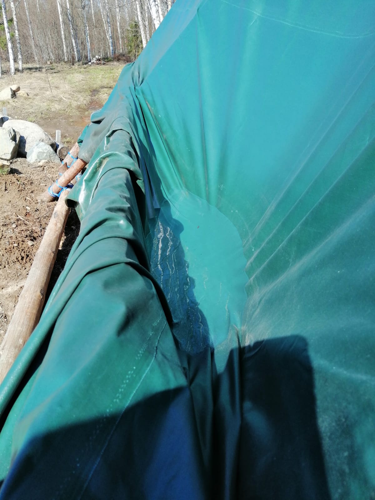 Mutta, kun kevät saapui niin tuli ilmi monta parannustarvetta. Ensiksikin sulava lumi teki poikkituen päälle isot vesi- / jääpussit. Osittain syy on myös se, että pressu on liian iso ja taitettu alhaalta kaksinkerroin, jolloin sen sitominen tiukalle ei onnistu.