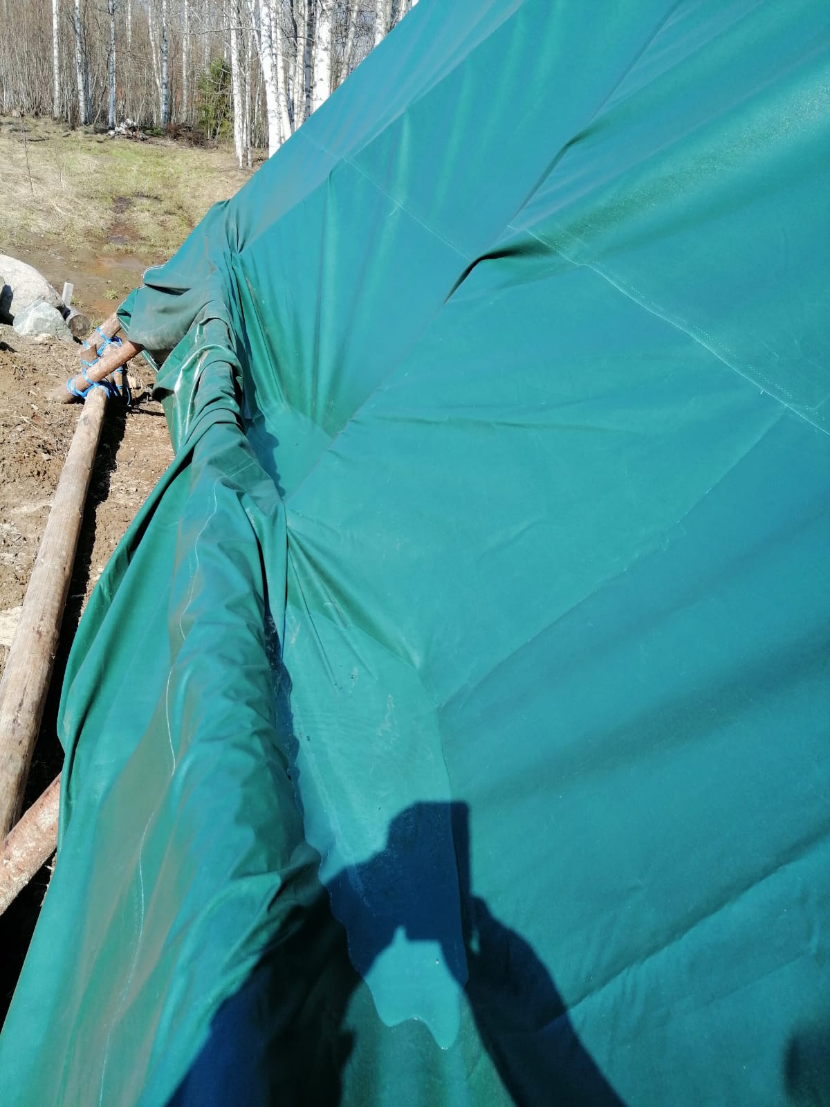 Lopputulos on paljon parempi vastoinkäymisistä huolimatta. Nimittäin katokselle varattuun paikkaan kesken kaiken nousi tulvavesi. Auto ja nostin upposivat liejuun ja traktorikin onnistui hoitamaan tehtävänsä juuri ja juuri. Lisäksi pressuja kiinnitettäessä tuli lähes myrskytuuli ja repi ensimmäiset (kevyt) pressut aikalailla rikki. Ja jälleen kerran tuli hankituksi ihan liian isot uudet pressut.