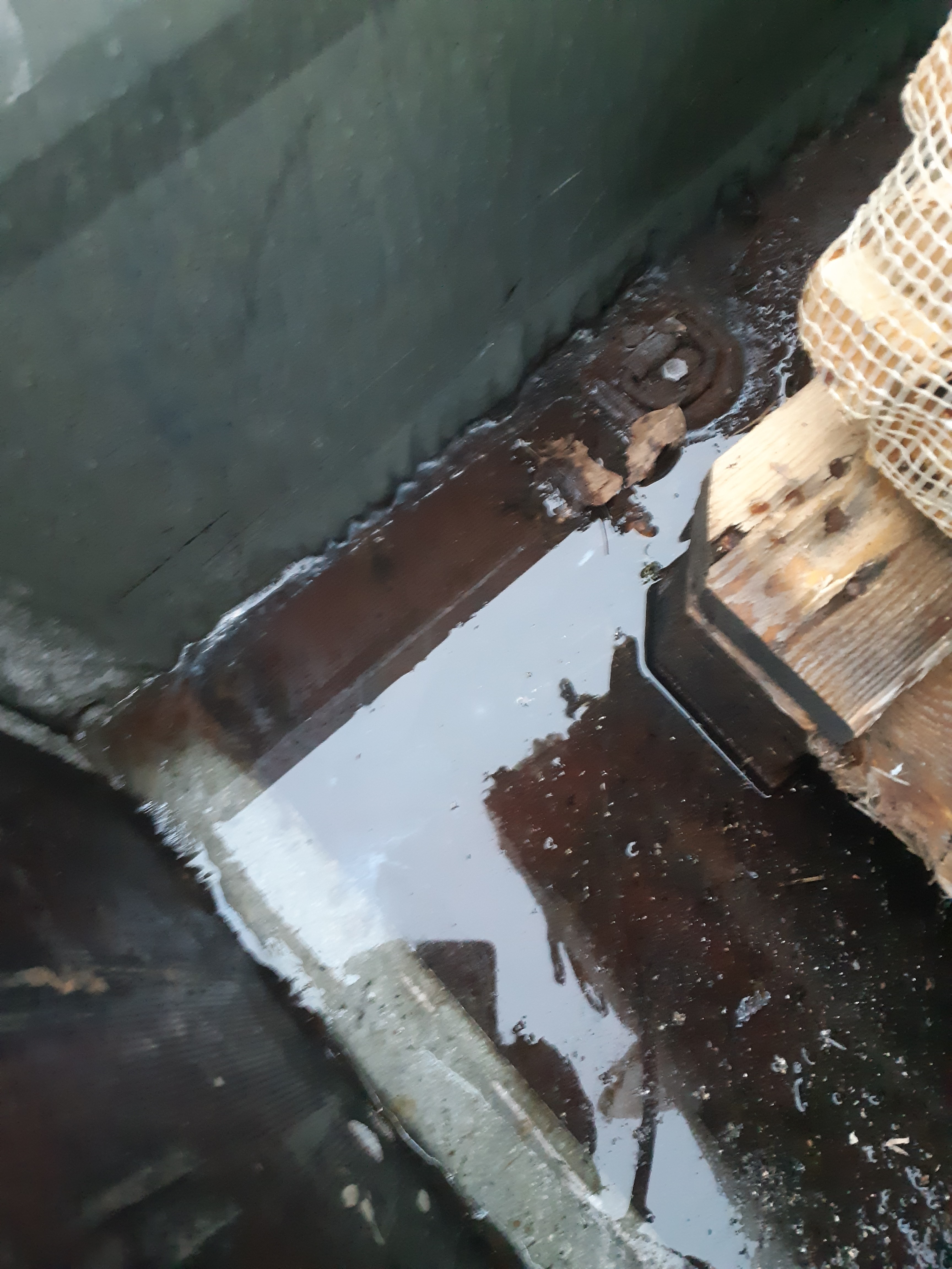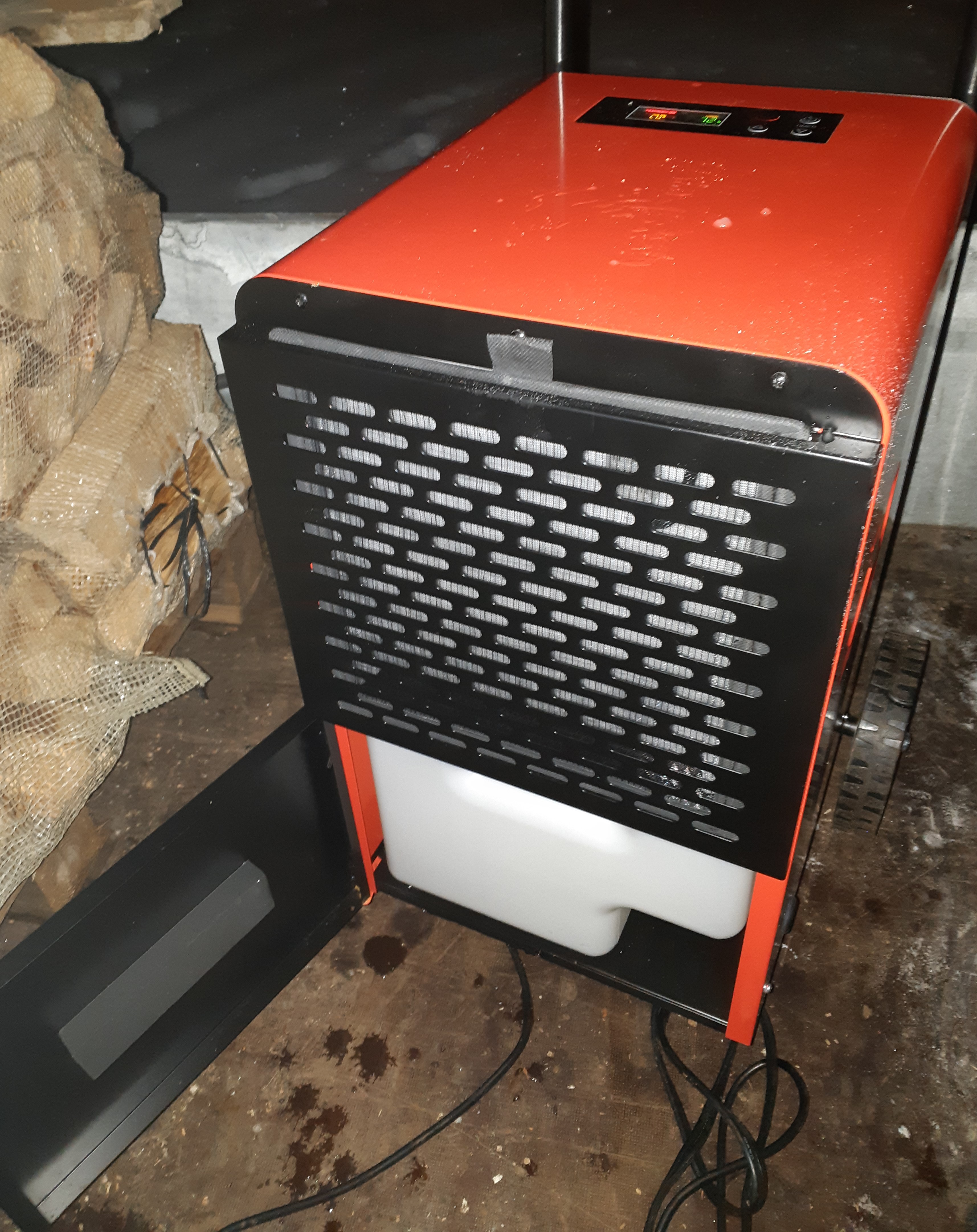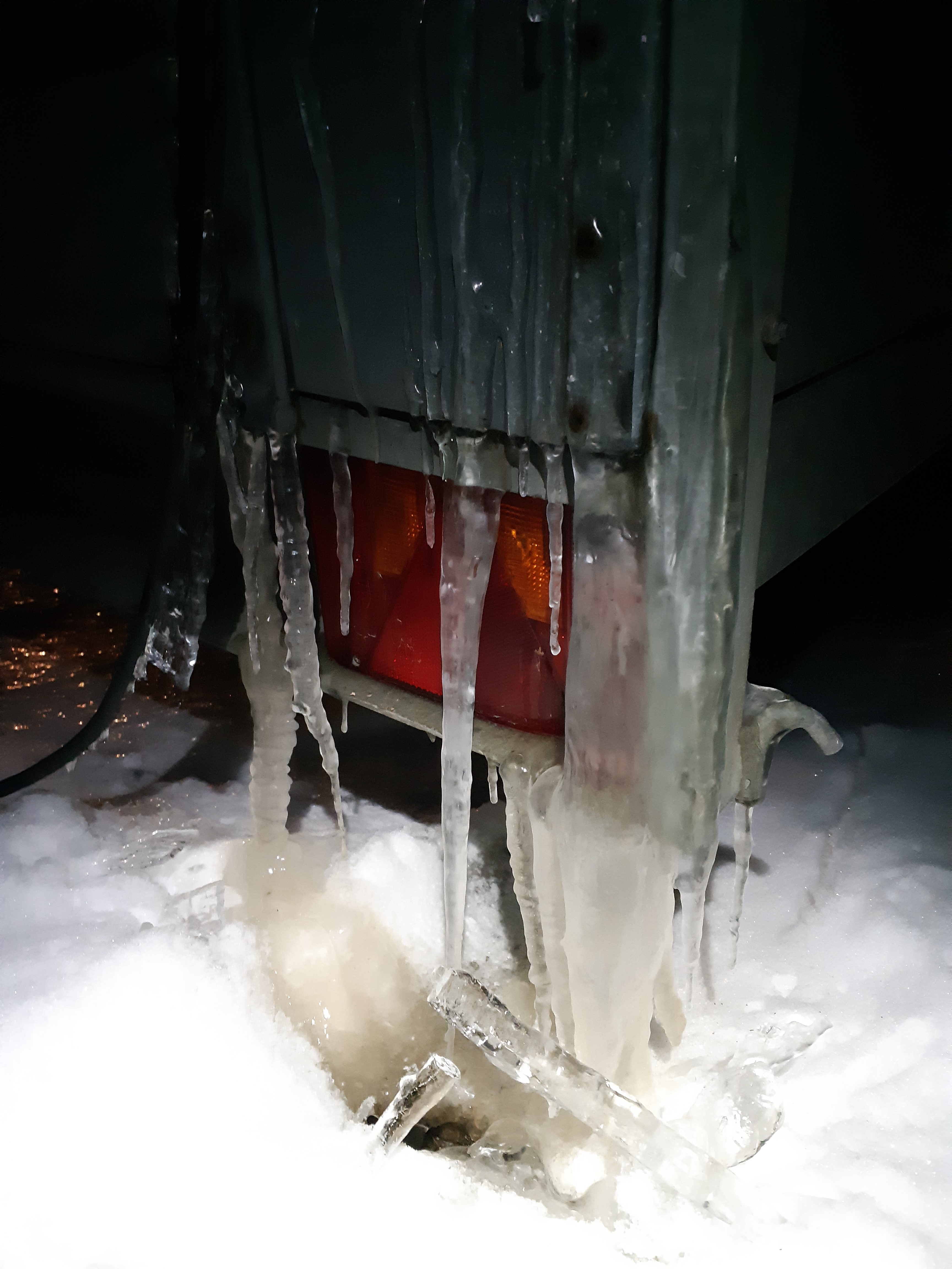 Ja kylläpä sitä vettä irtoaakin. Lämmitintä tankkaamaan mennessä pitää olla sadetakki, Kuomusta tippuu niin paljon vettä. Kärryn pohjalle kertyy reilut rapakot, vaikka osa vedestä valuu kärryn nurkasta ulos ja jäätyy puikoiksi. En osaa arvioida paljonko vettä lähtee näin pois yhdessä vuorokaudessa. Kymmeniä litroja ehkä?