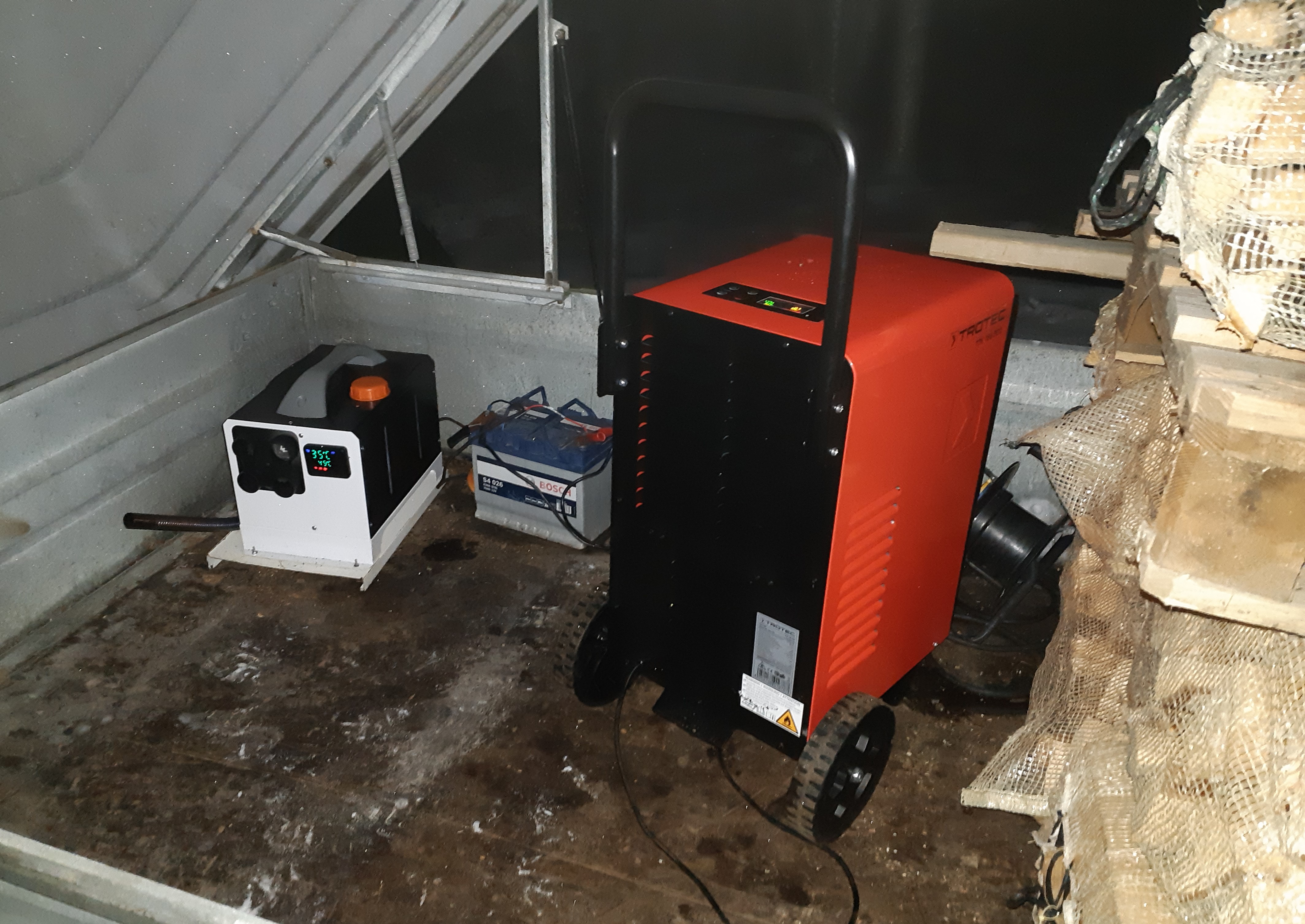 Näin videon, jossa "metsäman" kokeili hallilämmitintä. Arvelin, että se on liian tehokas ja polttaa puut ja kärryn. Löysin netistä oheisen "kiina webasto" ratkaisun, joka on osoittautunut hyväksi.Ja jos se ei toimi, voin asentaa sen auton lämmittimeksi.
